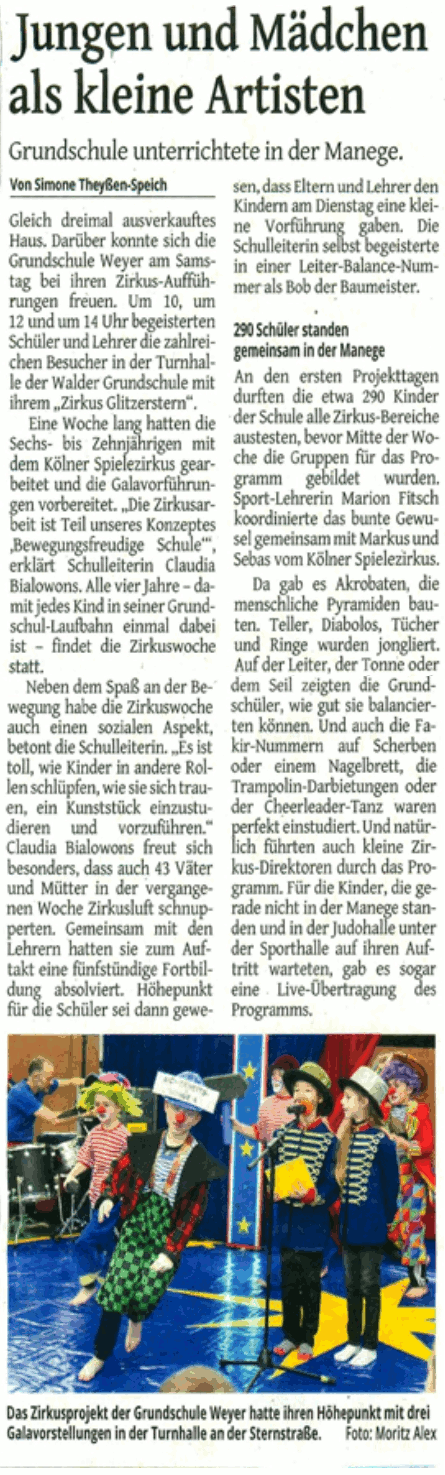 Das Zirkusprojekt findet alle vier Jahre statt, sodass jedes Kind im Laufe der Grundschulzeit einmal die Möglichkeit erhält, dieses mitzuerleben. Das Projekt ist stets so angelegt, dass alle Kinder eine Woche lang Zirkusluft schnuppern und aktiv an Angeboten in den folgenden Bereichen teilnehmen können: z.B. Jonglage, Akrobatik, Clownerie, Balancieren. Die Kinder dürfen individuell ein Angebot auswählen, das ihnen am besten gefällt und arbeiten innerhalb der Zirkuswoche an entsprechenden Kunststücken. Dabei werden sie von der Zirkusfamilie und den Lehrerinnen und Lehrern unterstützt. Am Ende der Woche (Freitag und Samstag) findet eine große Galavorstellung vor Publikum statt, zu dem alle Familien herzlich eingeladen sind.
